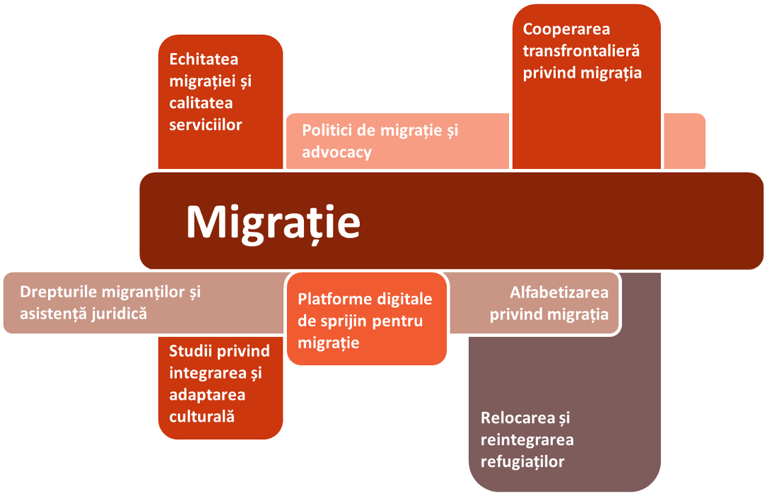 Inițiative pentru colectarea de date și realizarea de studii privind tendințele, impactul și politicile în domeniul migrației. Astfel de programe urmăresc să influențeze elaborarea politicilor, să îmbunătățească gestionarea migrației și să aprofundeze înțelegerea modelelor de migrație.